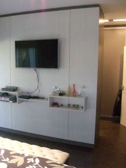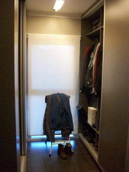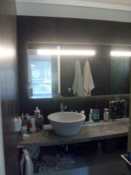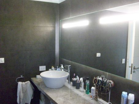 Toilette revestido en porcelanato con guarda en tocetos de vitrofusion, mesada en granito con bacha sobre la mesada. Placard de recepción.
