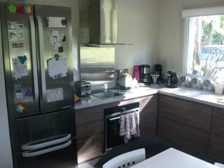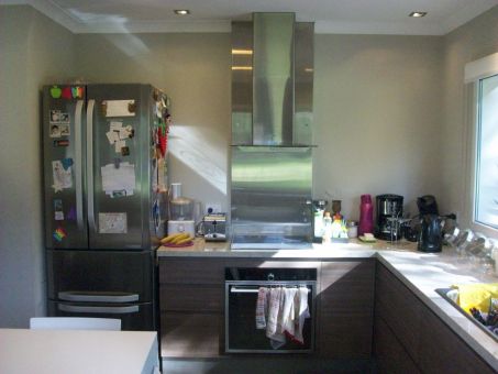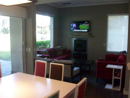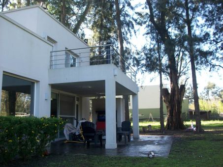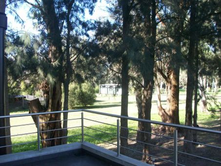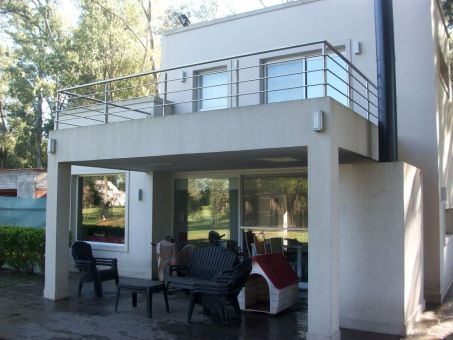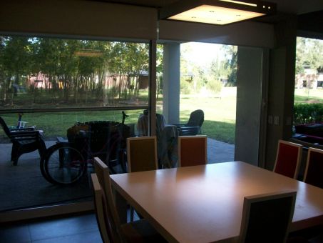 Entrada vehicular con estacionamiento para tres autos, hall de entrada con vista al parque, living con hogar a leños Tromen y detalles de iluminación sobre la pared, comedor con salida a la galería amplia en pórfido con parrilla. Cocina/comedor diario, mesada de granito beige, muebles de melanina símil madera, anafe y horno eléctrico, campana de acero inoxidable, la cocina tiene ventanal al frente y salida a un lateral donde se encuentra el lavadero.