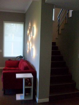 Planta alta: Escalera en porcelanato, baranda de acero inoxidable, blindex corredizo en el estar amplio, dos dormitorios al frente con amplios placares de melanina con puertas corredizas, un baño completo con mesada tipo carrara y bacha sobre mesada, sanitarios Ferrum, revestimiento en porcelanato. El dormitorio principal al contrafrente con vestidor y baño en suite con mesada en granito gris y ducha con blindex revestido en porcelanato, amplio balcón